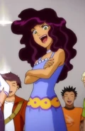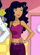 She has long curly/wavy black (dark red in "Totally Spies! The Movie", like Dominique's) hair, light green eyes, caramel-tan skin, and wears lilac/plum purple lip gloss. Her primary outfit is a dark pink crop top, dark purple skirt, dark pink high-heels, and dark pink boots.