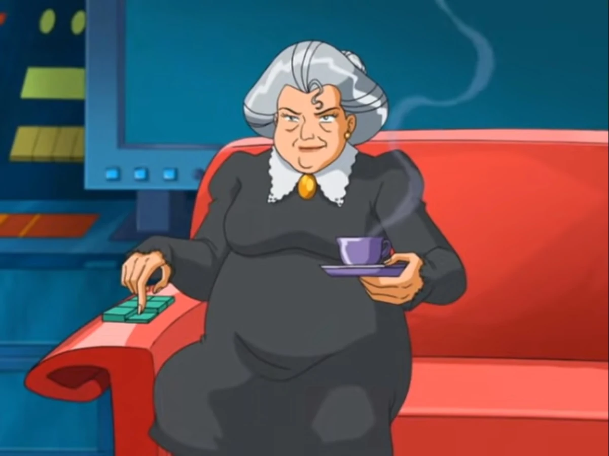 As an Elderly Woman, Quivers has a Grey/Gray Hair like a Chinese like Ponytail, then wears a Charcoal Dress with the White Collar and Gold Button to the Collar. She wear Black Pantyhose, and Gray Mary Jane Shoes.